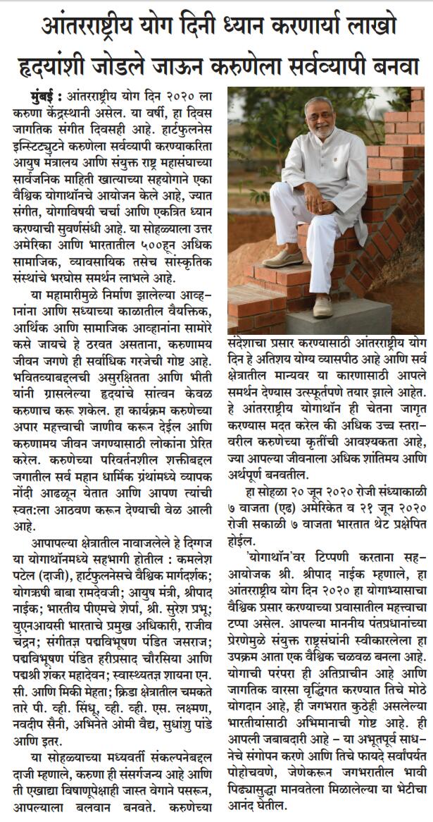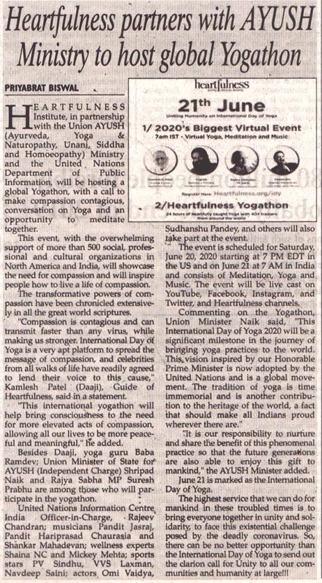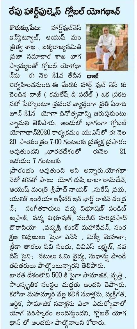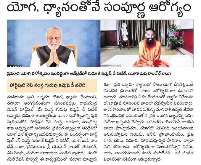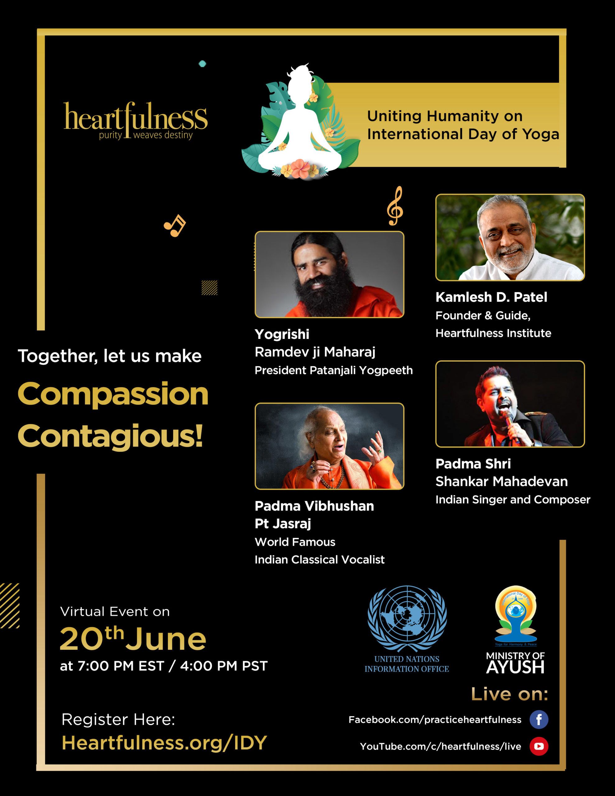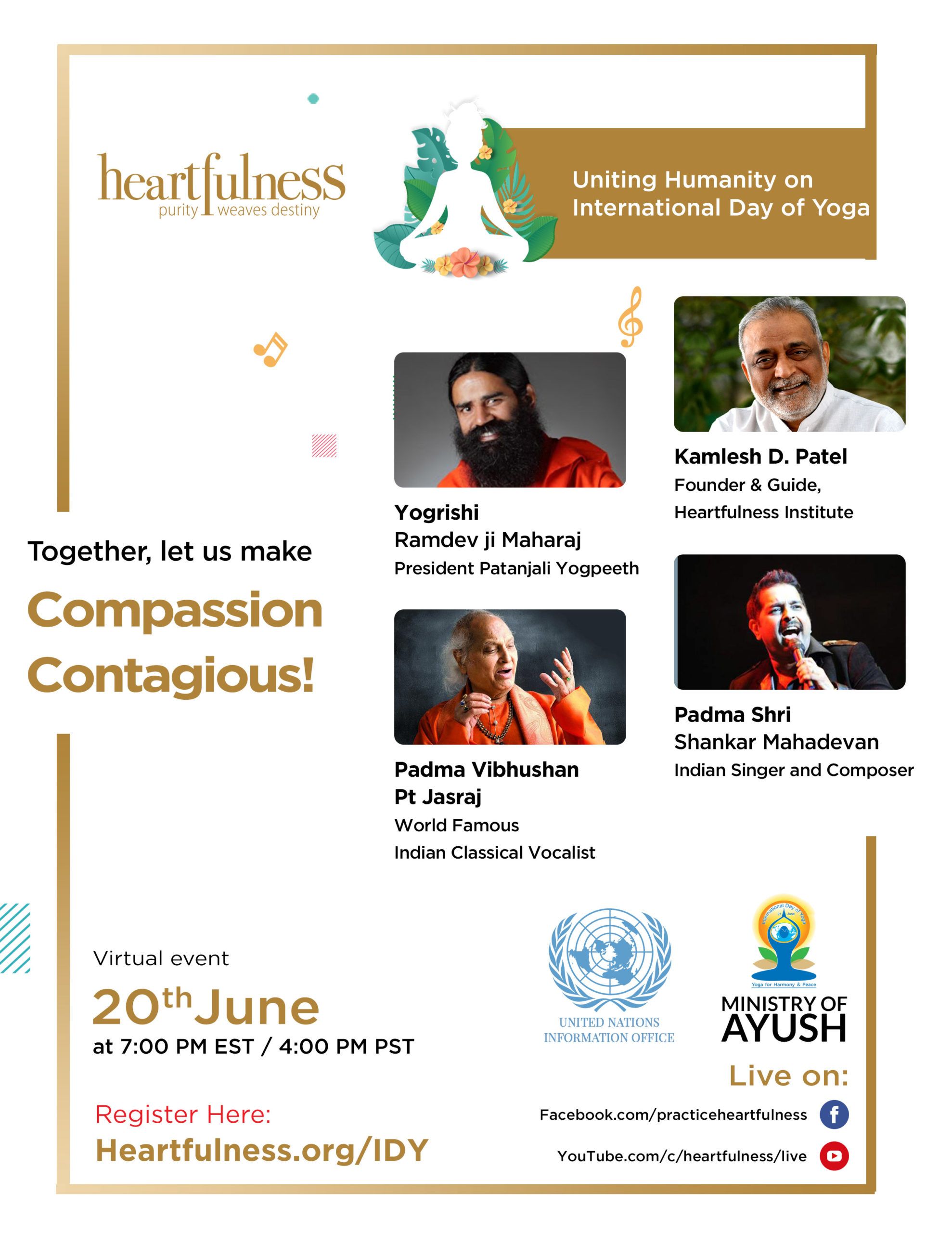 The Heartfulness Institute is very happy to join hands with the Ministry of AYUSH to organize this global virtual live event of music, Yoga and meditation with well-known musicians along with Yogrishi Baba Ramdev and Kamlesh Patel, the Guide of Heartfulness.