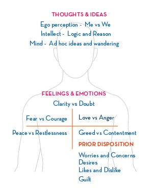 To understand the functioning of our intellect better, we need a conceptual model of how it works with the rest of our heart-mind vibrational field. We have thoughts, feelings and emotions. These are not physical things, but they are part of us. Since they are not part of our body but are part of us, we say in a broad sense that they are part of our mind. However, as we get more granular, we realize that the mind functions when we are conscious, so we have something called consciousness. We also see that while our mind produces thoughts, some part of us evaluates people, situations, ideas etc., performs analysis, applies reasoning and makes decisions. We call this the intellect. We also know that we have an ego, which maintains a mental model of ourselves, which it is constantly updating, based on interactions with the external world and based on internal inspirations. We therefore end up with four main things: mind, intellect, consciousness and ego, which work together to accomplish what we may call mental processes.