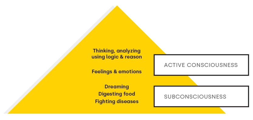 Swami Vivekananda, a 19th century mystic who spoke a lot about consciousness, said that active consciousness was like a thin film, sandwiched between an ocean of superconsciousness and an ocean of subconsciousness. The measurement of brainwave frequencies has now scientifically established this. More than 80% of our brain activity is associated with activities that are unconscious, not our active consciousness. You can also think of active consciousness as just the tip of the iceberg. In fact, how our active consciousness works is also influenced, to a very large extent, by what lies beneath.