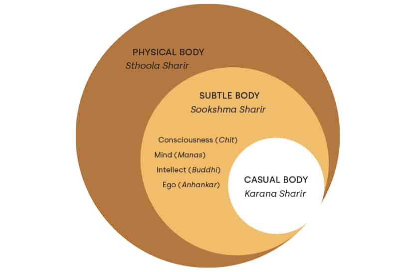 The soul is the center of our being, around which we have the four main subtle bodies that we know as the mind. The first is consciousness, the canvas that is the field or fabric of the subtle body. Then there is the ego, which is our identity, so it is also deeply entwined with the individual soul. Then comes intellect, which allows us to discern and make choices, and then at the surface level of the mind we have the thinking function. And then there is the physical body, which is the outermost layer. If noticed keenly, it is always the ‘subtle’ that supports the ‘less subtle’ in its wake. The soul is the subtlest, followed by consciousness, ego, intellect, mind and finally the physical body, and hence the origin of the sequence in the order mentioned above.
